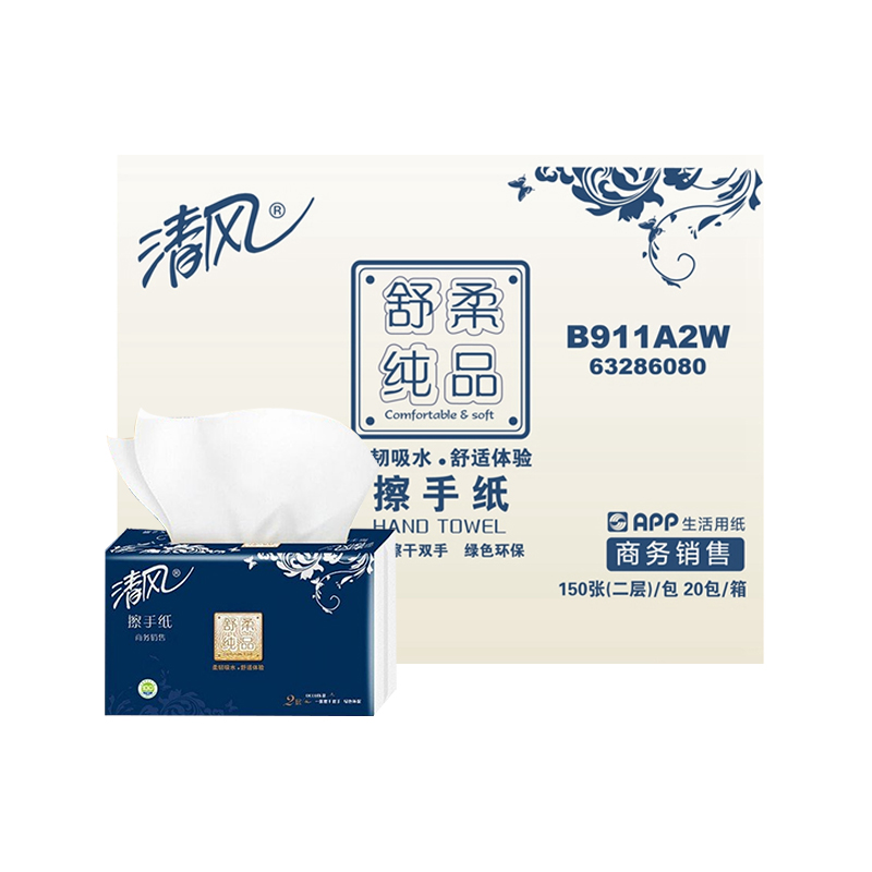 B911A2W 清风舒柔纯品(银装2层DECO压花150张 225*230mm 150张/包*20包/箱